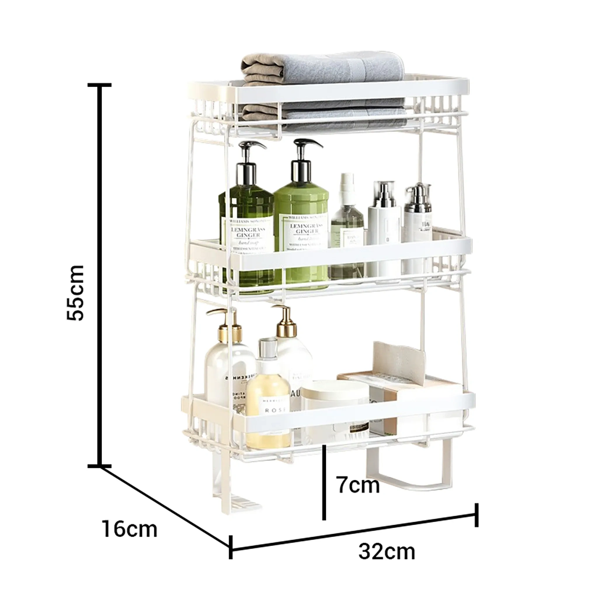 Highlights: Drei geräumige Fächer für Pflegeprodukte, platzsparendes Design, verstärkter Rahmen für schwere Gegenstände, schnelle Montage ohne Bohren, langlebig und vielseitig einsetzbar.