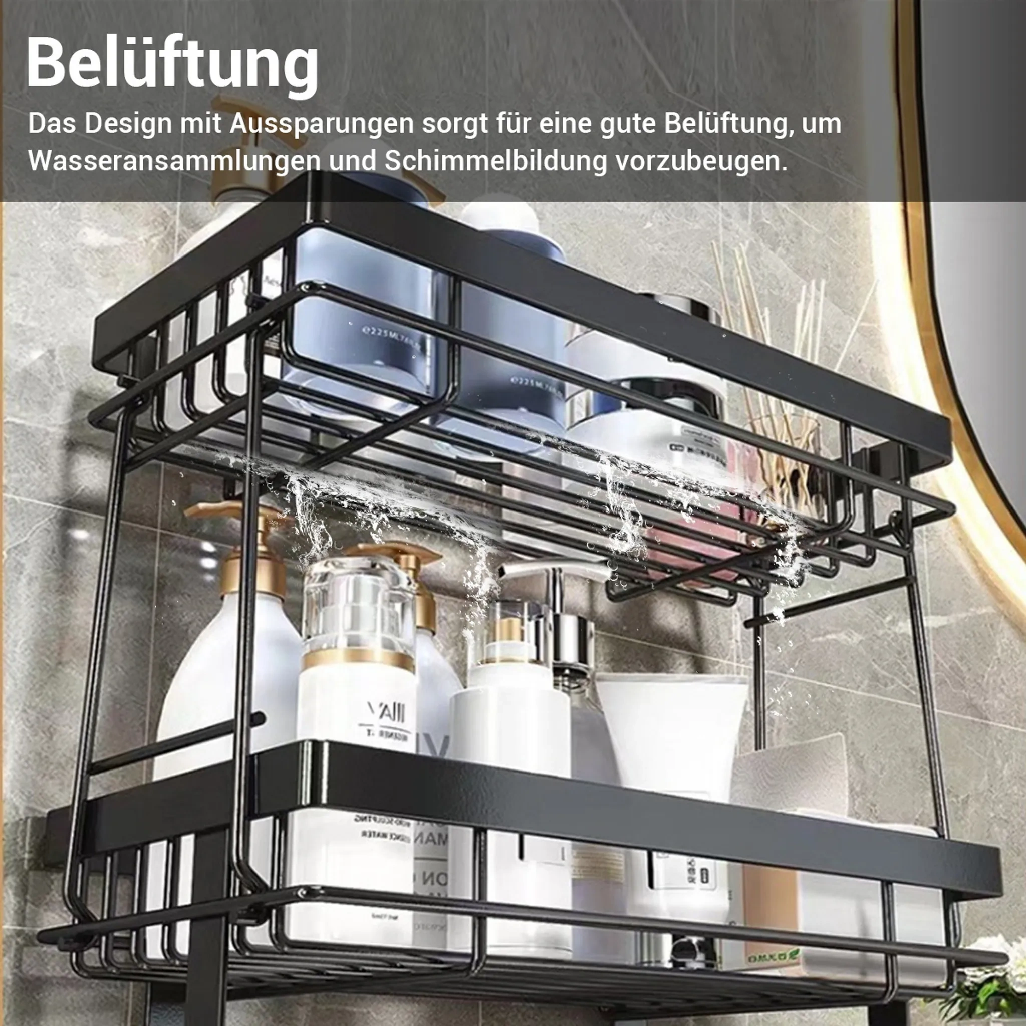 Die belüfteten Aussparungen verhindern Wasseransammlungen und Schimmelbildung, während die breiten Körbe eine sichere Aufbewahrung gewährleisten. Die Montage erfolgt schnell und unkompliziert ohne Bohren mithilfe des mitgelieferten Klebebands.